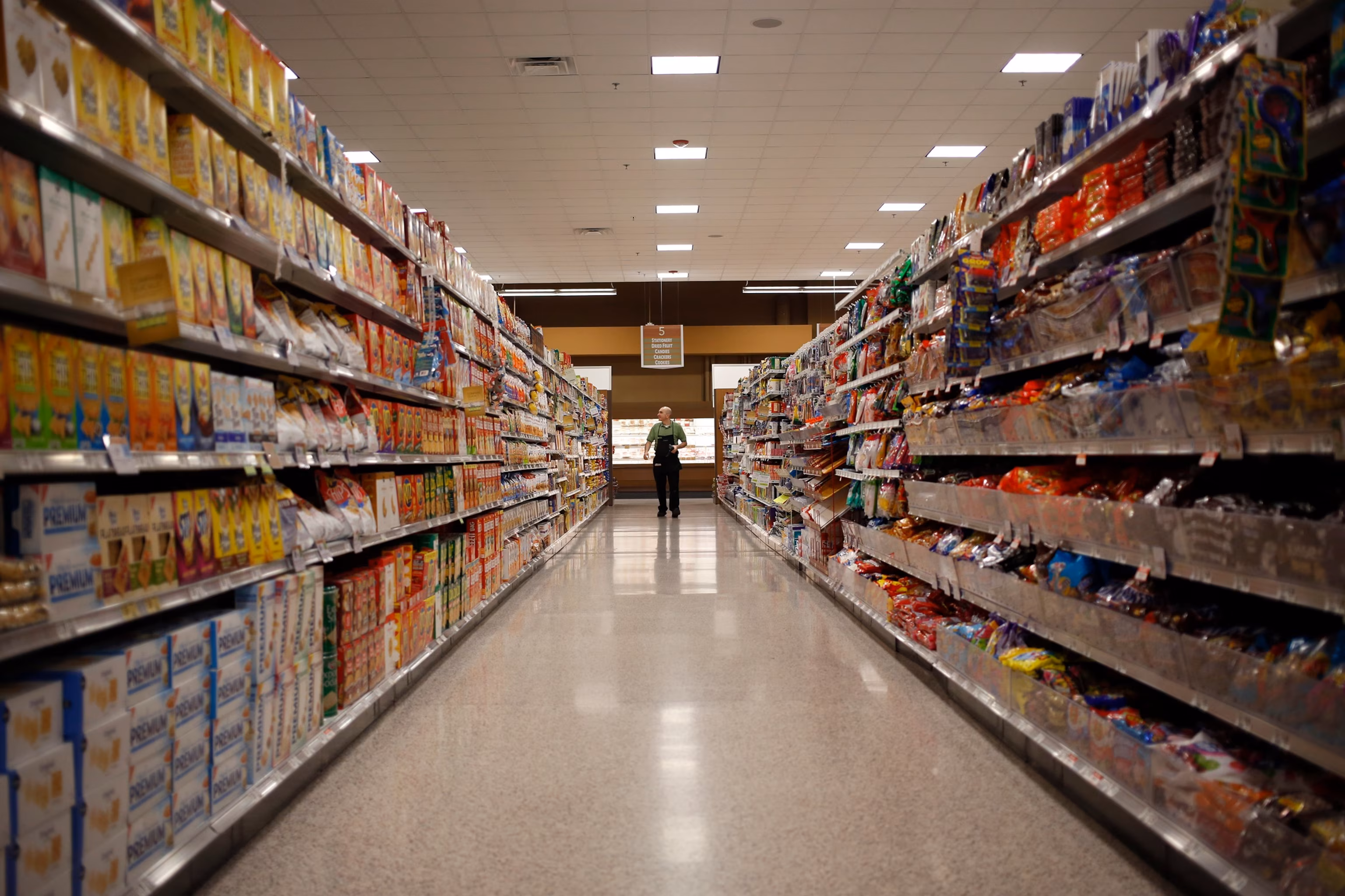 Shelves of crackers, cookies, and candy stand inside a Publix Super Markets Inc. grocery store in Knoxville, Tenn., March 5, 2014.