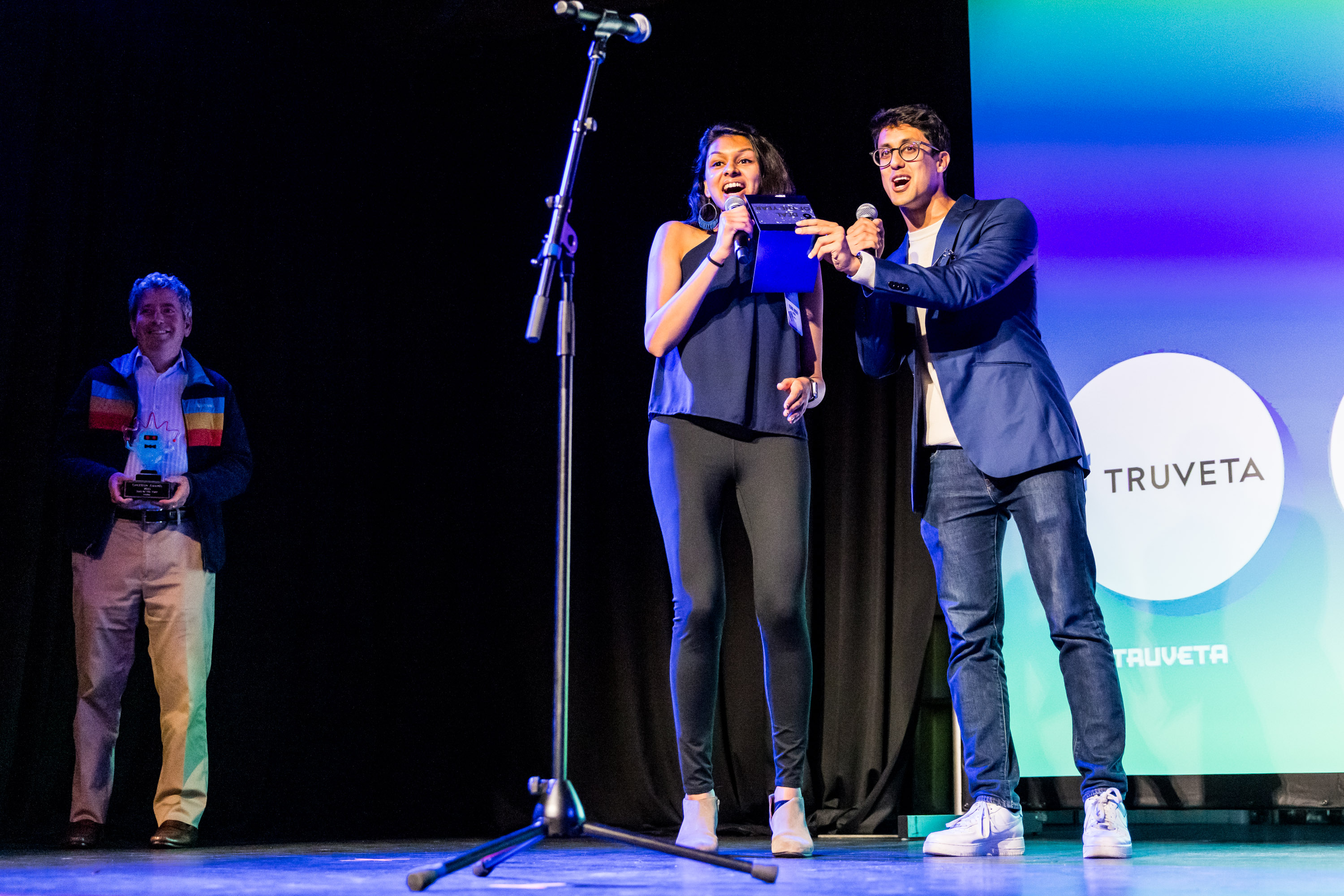 Yoodli co-founders Esha Joshi (left) and Varun Puri at the GeekWire Awards in Seattle last year. (GeekWire File Photo / Dan DeLong)