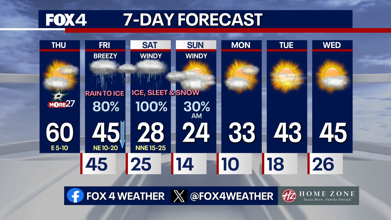 Thursday will be the last mild day of the week, featuring highs in the low 60s and partly to mostly cloudy skies. Most of Friday will feature liquid rain, but a changeover to frozen precipitation is expected between 7 p.m. and 9 p.m., beginning along the Red River before moving into the Metroplex and eventually further south.