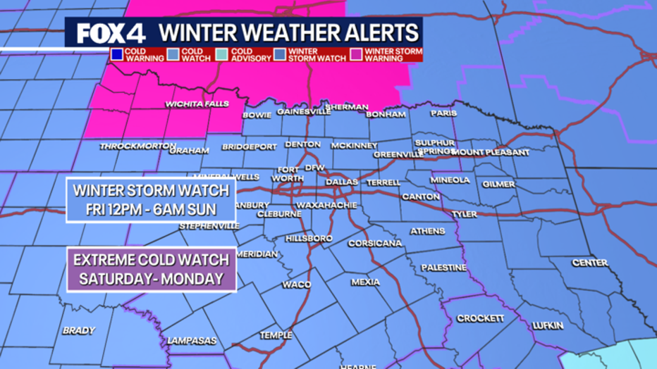 The National Weather Service has issued a Winter Storm Watch for North and Central Texas starting Friday afternoon and continuing through Sunday morning. An Extreme Cold Watch will also be in effect from Saturday evening through Monday morning.
