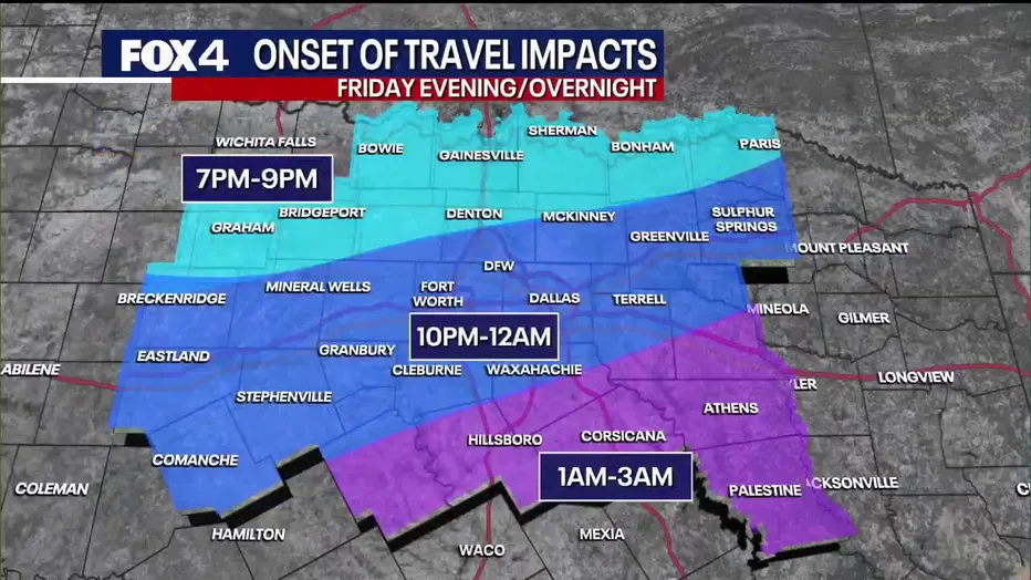 North of DFW (Sherman, Paris, Graham): Sleet is expected to begin around 6 p.m. Friday, transitioning to mostly snow by Saturday. Significant accumulation is expected around 6 a.m. Saturday.