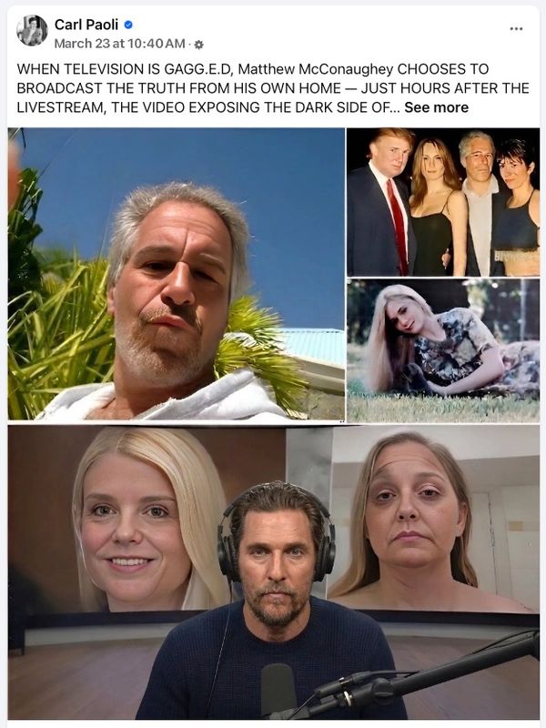 That post (archived), which appeared on performance life coach Carl Paoli’s Facebook page on March 23, began in part, “WHEN TELEVISION IS GAGG.E.D, Matthew McConaughey CHOOSES TO BROADCAST THE TRUTH FROM HIS OWN HOME — JUST HOURS AFTER THE LIVESTREAM, THE VIDEO EXPOSING THE DARK SIDE OF POWER EXPLODED TO 3.2 BILLION VIEWS WORLDWIDE.” A Snopes reader also sent this same bit of text via our contact form.