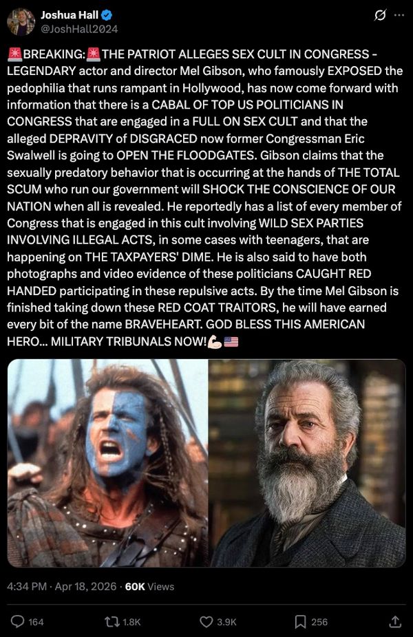In April 2026, online users alleged actor and Oscar-winning director Mel Gibson had exposed a massive sex cult in the U.S. Congress.