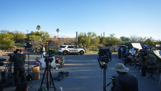 By the late morning of Feb. 15, cars lined the street of Guthrie’s home in the Catalina Foothills. The whir of a small drone could be heard above the canopies pitched by journalists.