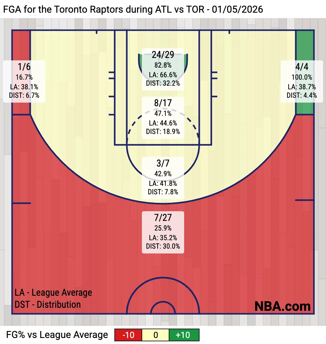 It’s not as though the Raptors excelled everywhere else — it’s average or far below average (aside from the corner three) but when you succeed this much at the rim, it’s very difficult to win games. Had the Raptors even hit close to league average for threes, this would have closer to a 30 point blowout. The Raptors’ drives, and good ball movement, just opened up the lane for the hosts, and the Hawks had little chance to contest at the rim if Okongwu was taken away from the play.