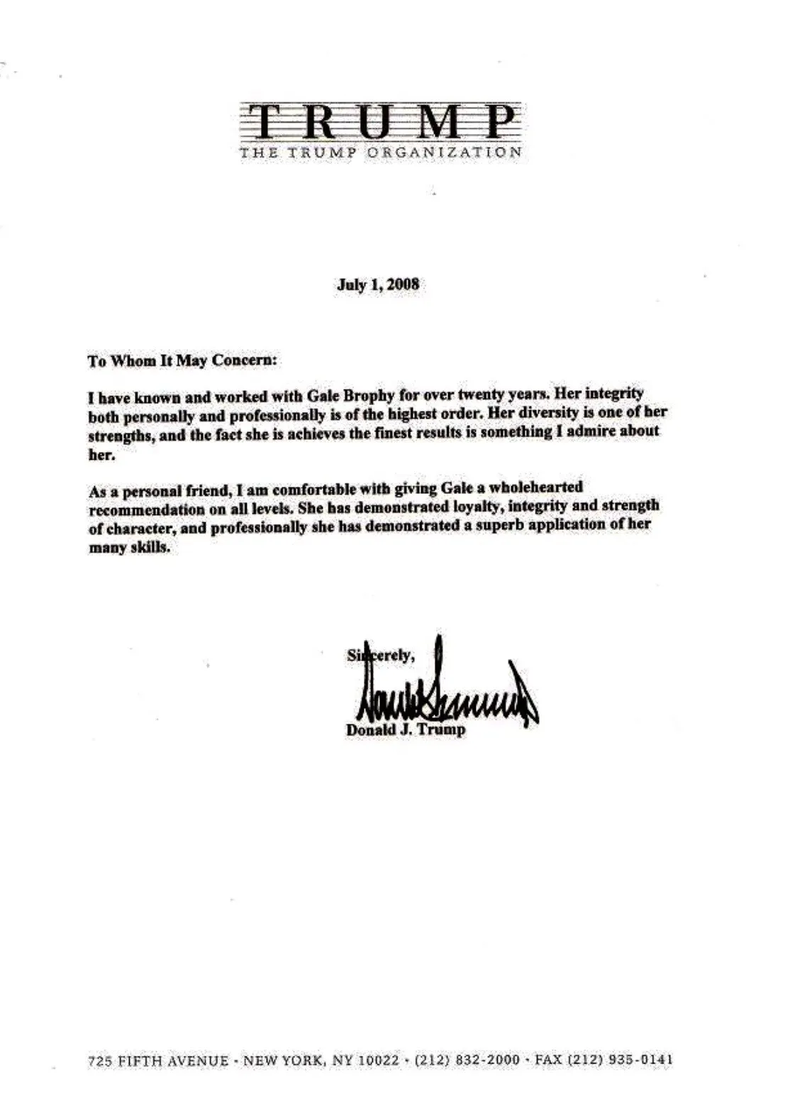 Brophy, a Palm Beach socialite, has a decades-long connection to the Trump family and denied that the president didn’t recognize her.  Brophy shared a recommendation letter from Donald with Newsweek. In the letter, written in 2008, Donald says he’s known Brophy for over 20 years and praises her integrity.