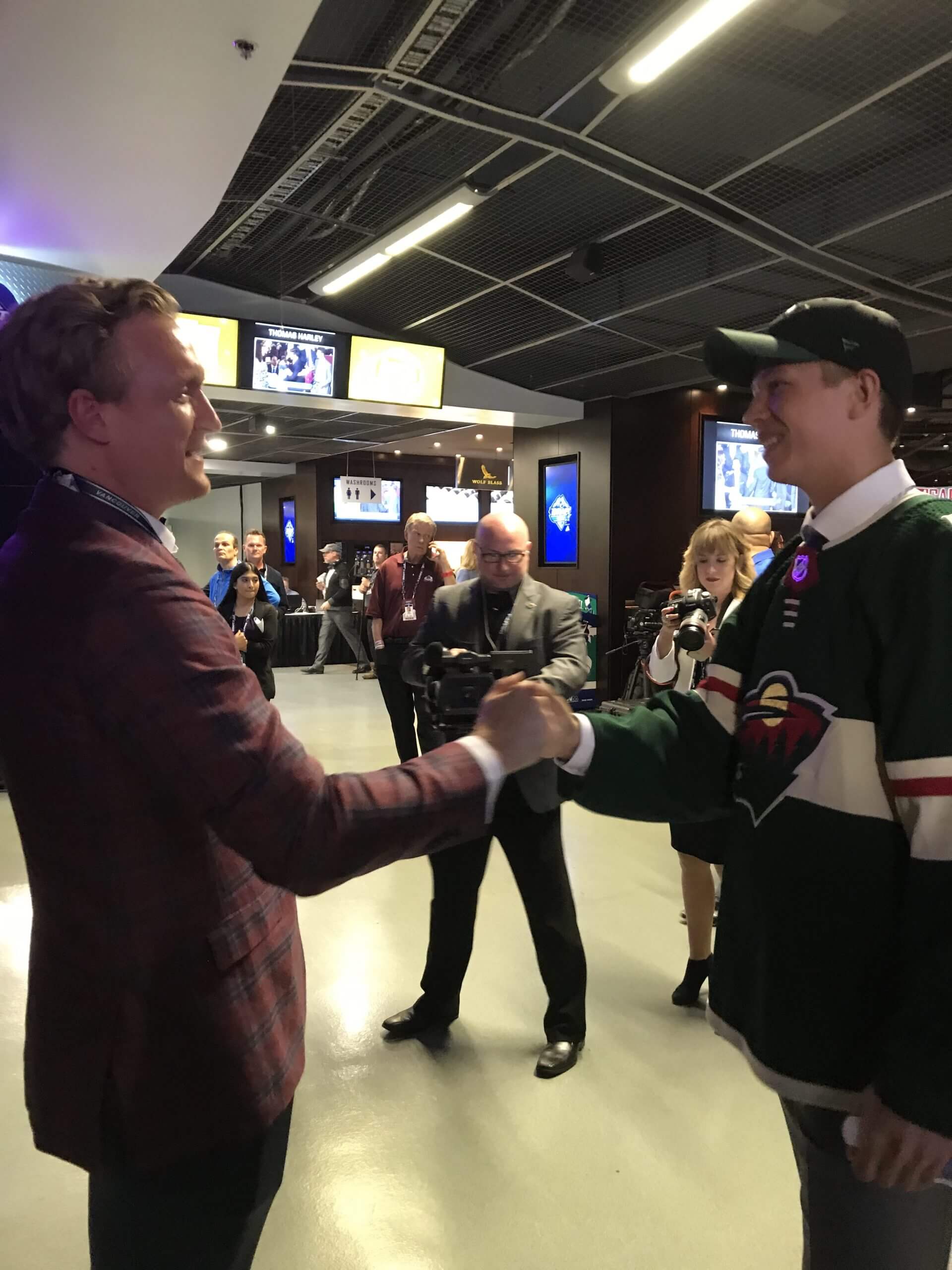 John Wroblewski congratulates Matt Boldy at the 2019 NHL Draft in Vancouver. (Michael Russo / The Athletic)