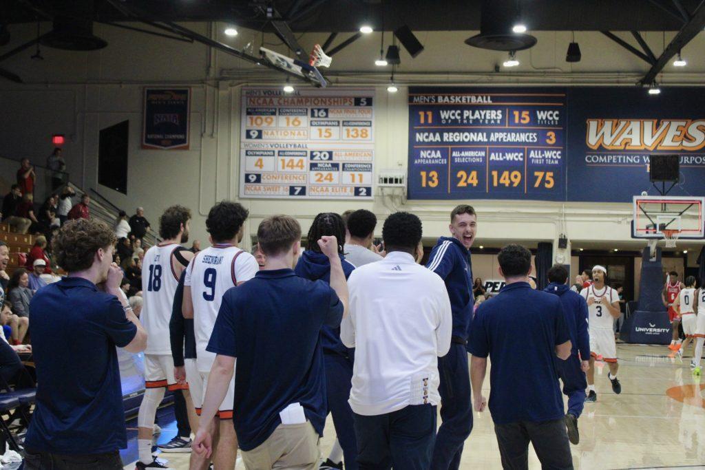 The Waves celebrate their thrilling 90–89 victory over the Lions on Feb. 14 at Firestone Fieldhouse, capping a heart-stopping comeback in the final seconds. Photo by Clementine Metz.