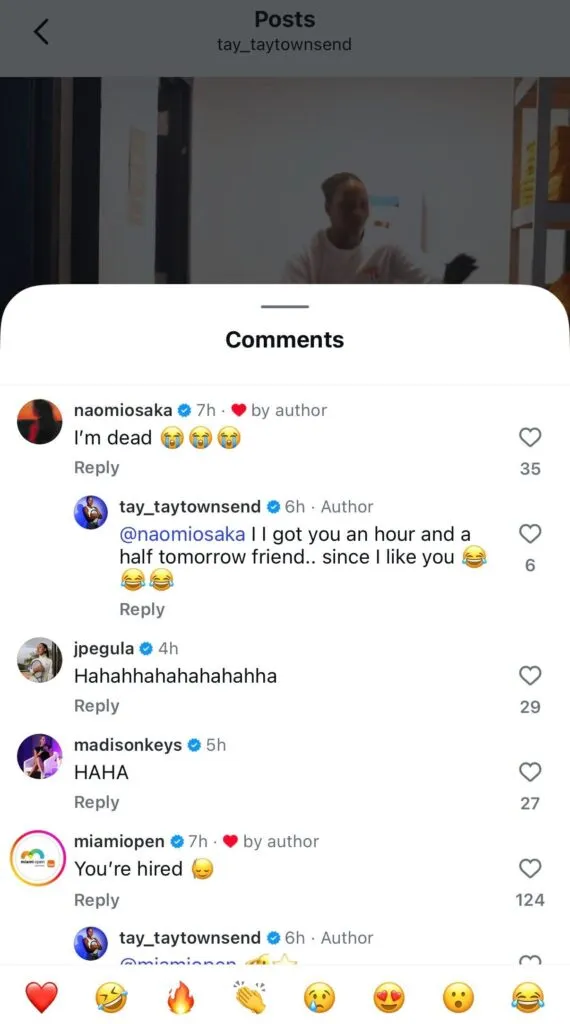 Townsend’s friend Naomi Osaka was the first to react to the video, commenting, “I’m dead.” Townsend was not letting it go, hilariously replying that she would get Osaka a practice court for some extra time since they were good friends off the court.