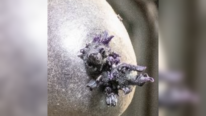 “I flew potatoes on Expedition 72 for my space garden, an activity I did in my off-duty time,” astronaut Pettit said. “This is an early purple potato, complete with a spot of Velcro hook to anchor it in my improvised grow light terrarium.”