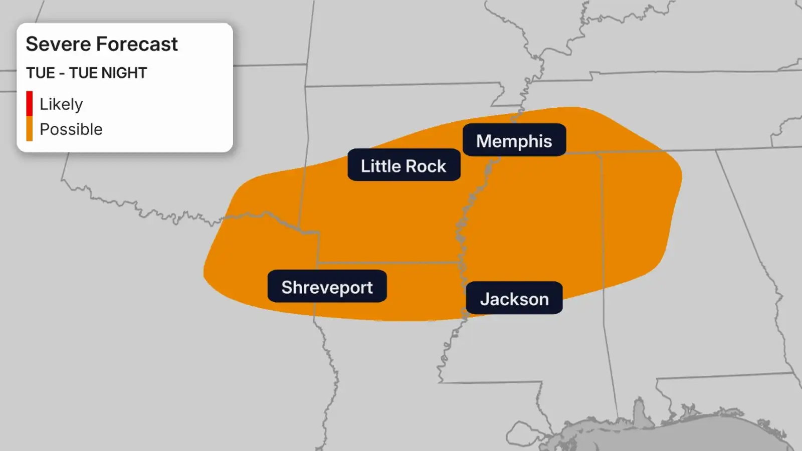 While it is still far out, the lingering frontal boundary can bring some severe storms across some of the Gulf Coast states into Tuesday. The greatest threat stretches from northeastern Texas to northwestern Alabama. Cities like Memphis, Little Rock, Shreveport and Huntsville need to be watching the weather carefully.