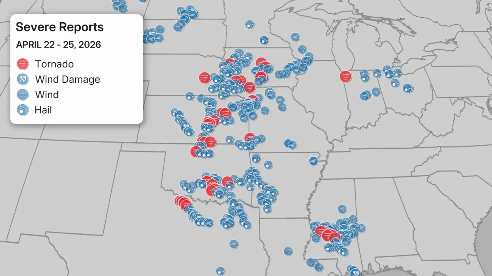 Reports of large hail, thunderstorm wind damage, thunderstorm wind gusts and tornadoes from April 13-17, 2026. Note: Reports of tornadoes do not necessarily correlate to the actual number of tornadoes, as determined by NWS damage surveys.