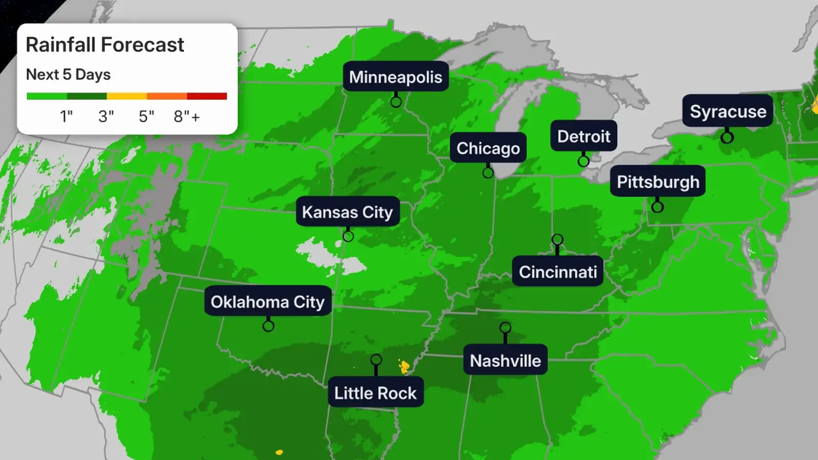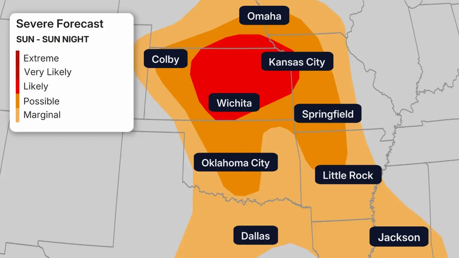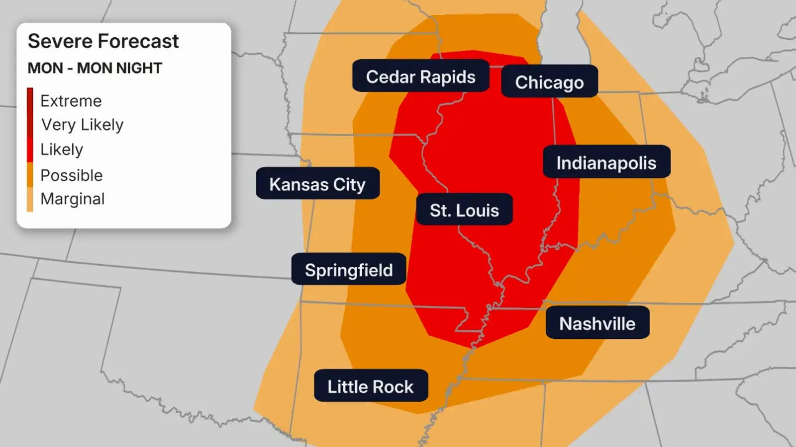 Places like St. Louis, Kansas City, Little Rock, Nashville, Indianapolis, Chicago and Des Moines should all be on alert.