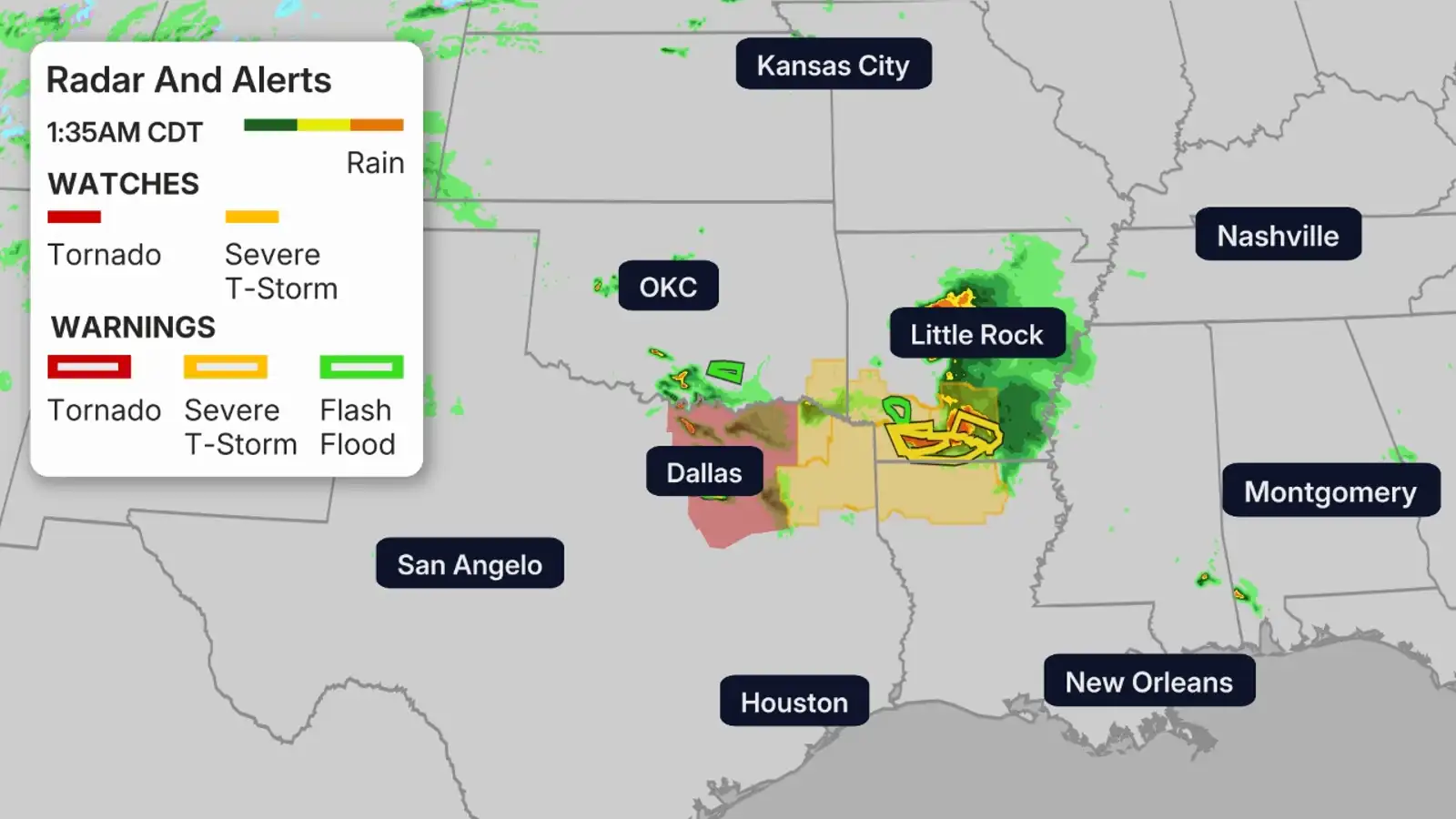 Any active tornado watches are red polygons, while any severe thunderstorm watches will be yellow polygons. Below is the latest radar.