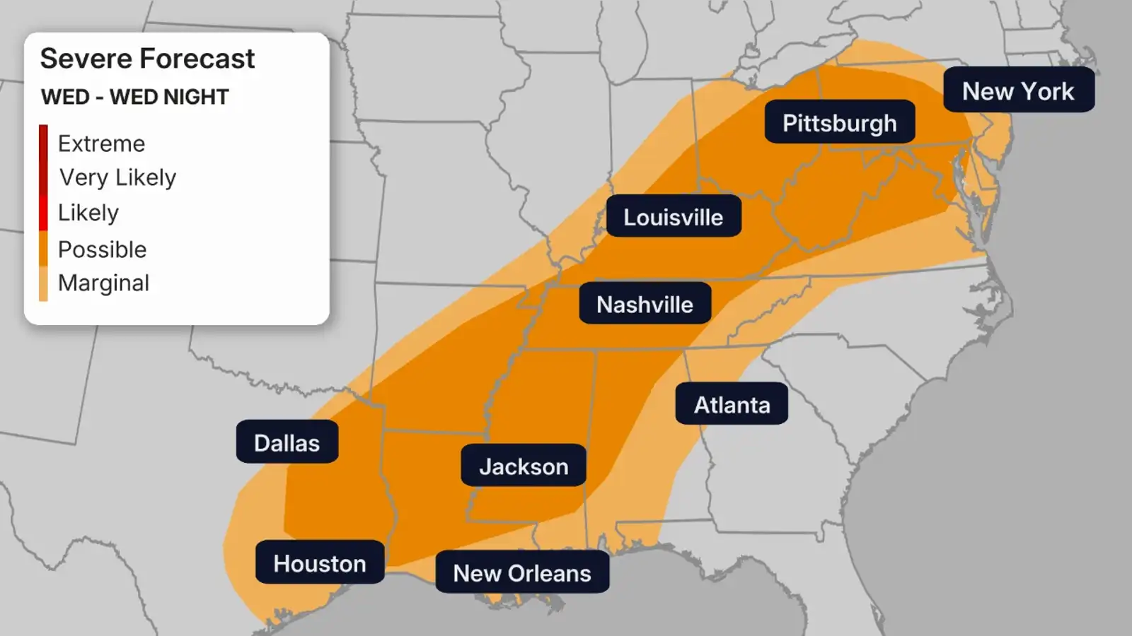 In general, Wednesday’s primary severe threat will be damaging thunderstorm wind gusts from parts of the Appalachians and interior Northeast to eastern Texas.