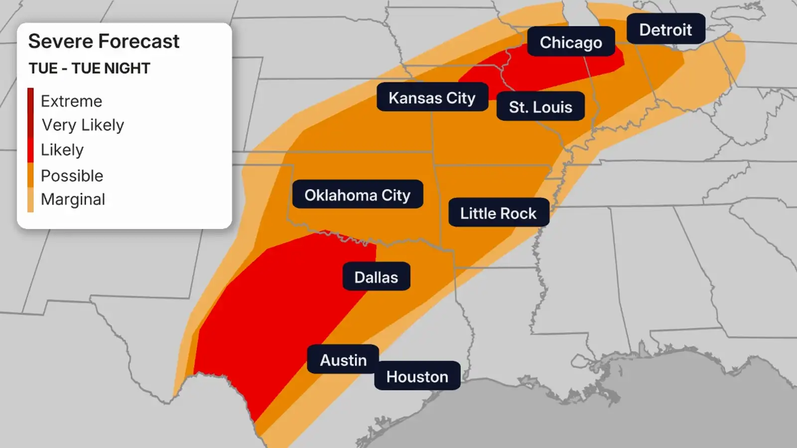 After a brief warm up in the region on Monday, the tornado threat looks to be highest Tuesday afternoon and evening in parts of Texas and the Midwest. The Storm Prediction Center have an enhanced risk of severe storms, their level 3 of 5, stretching from northwestern Missouri to northern Indiana. On Monday afternoon, they upgraded central Texas to an enhanced risk as well.