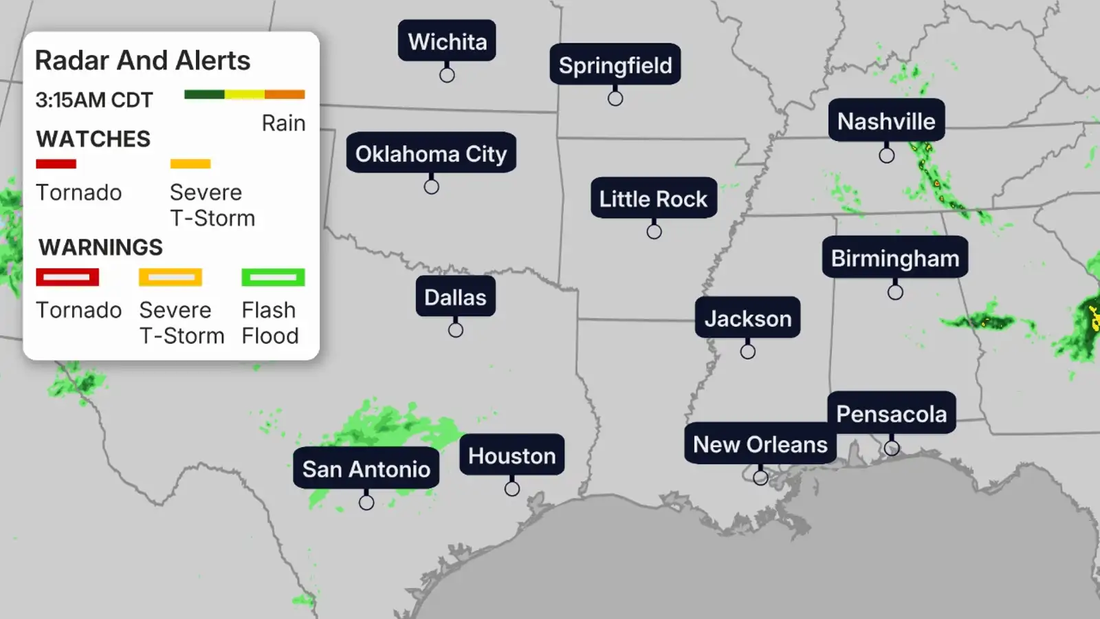 Thunderstorms, some of which may be severe, will persist into the night in the Southeast from the Tennessee Valley to the northern Gulf Coast.