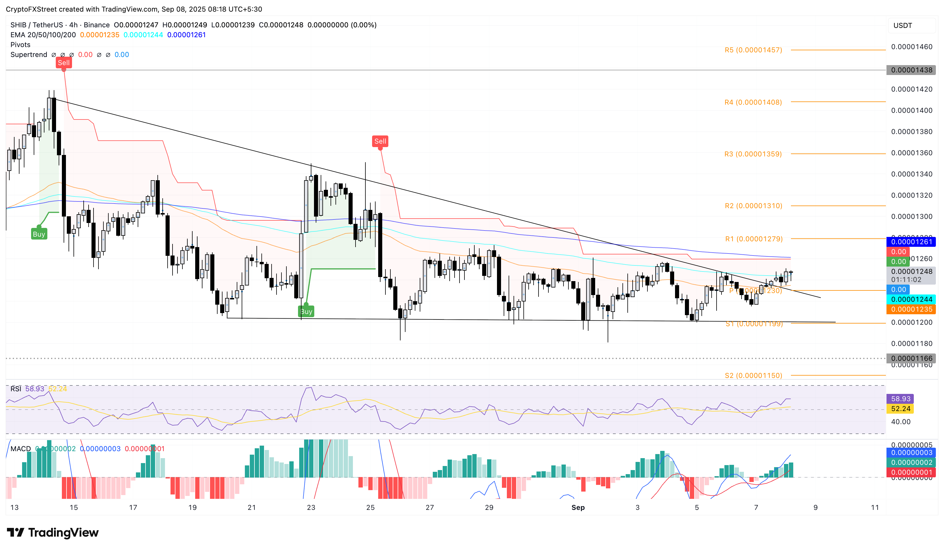 Shiba Inu marks the breakout of a descending triangle pattern on the 4-hour chart as the meme coin segment heats up. At the time of writing, SHIB holds above the 100-period EMA at $0.00001244, hinting at a renewed uptrend.