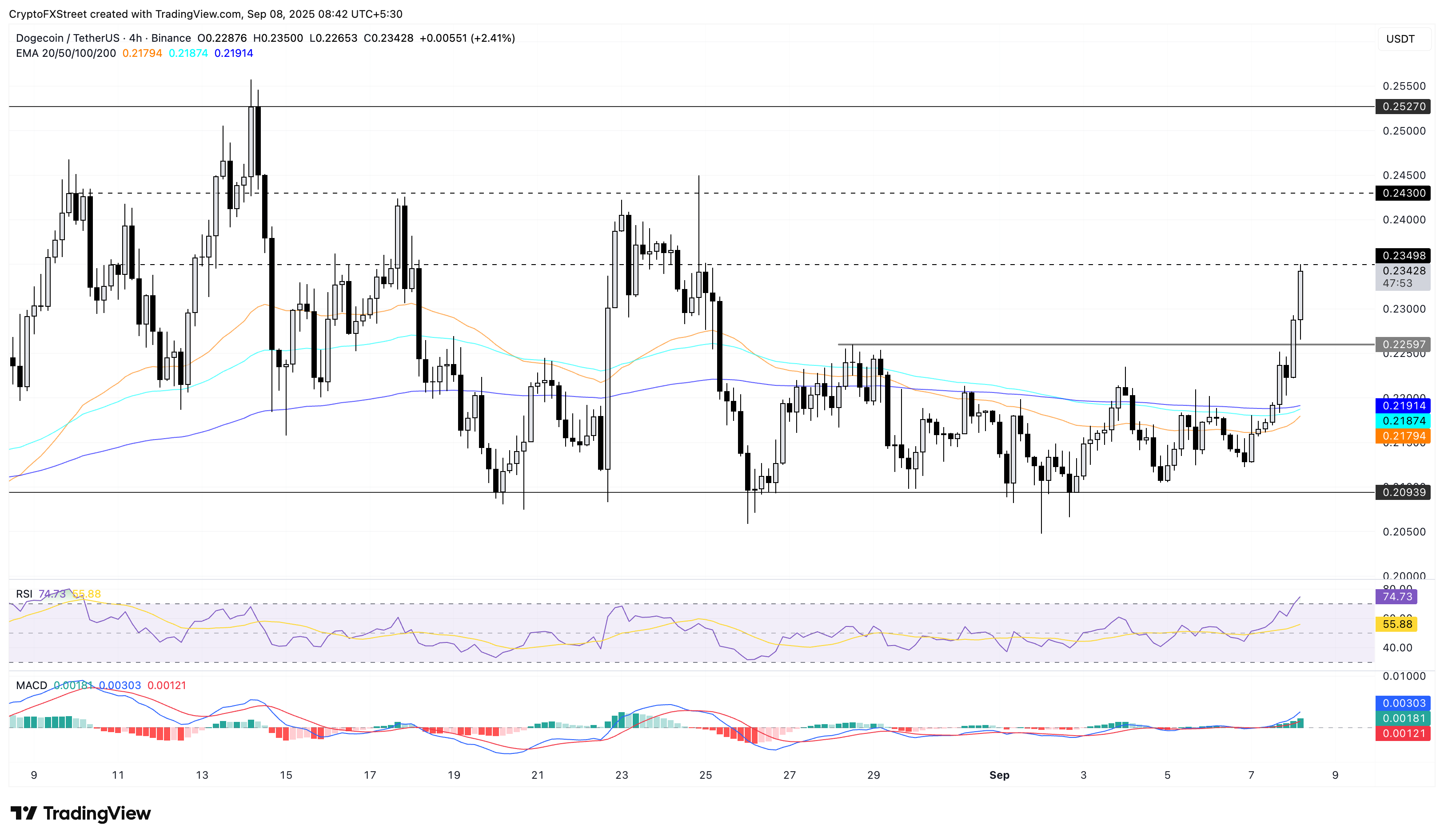 If DOGE marks a decisive close above this level, it could extend the rally to the $0.24300 level, last tested on August 24. Adding to the breakout chances, the 50-period Exponential Moving Average approaches the 200-period EMA, hinting at a Golden Cross, which would indicate a stronger short-term recovery compared to the prevailing long-term trend.