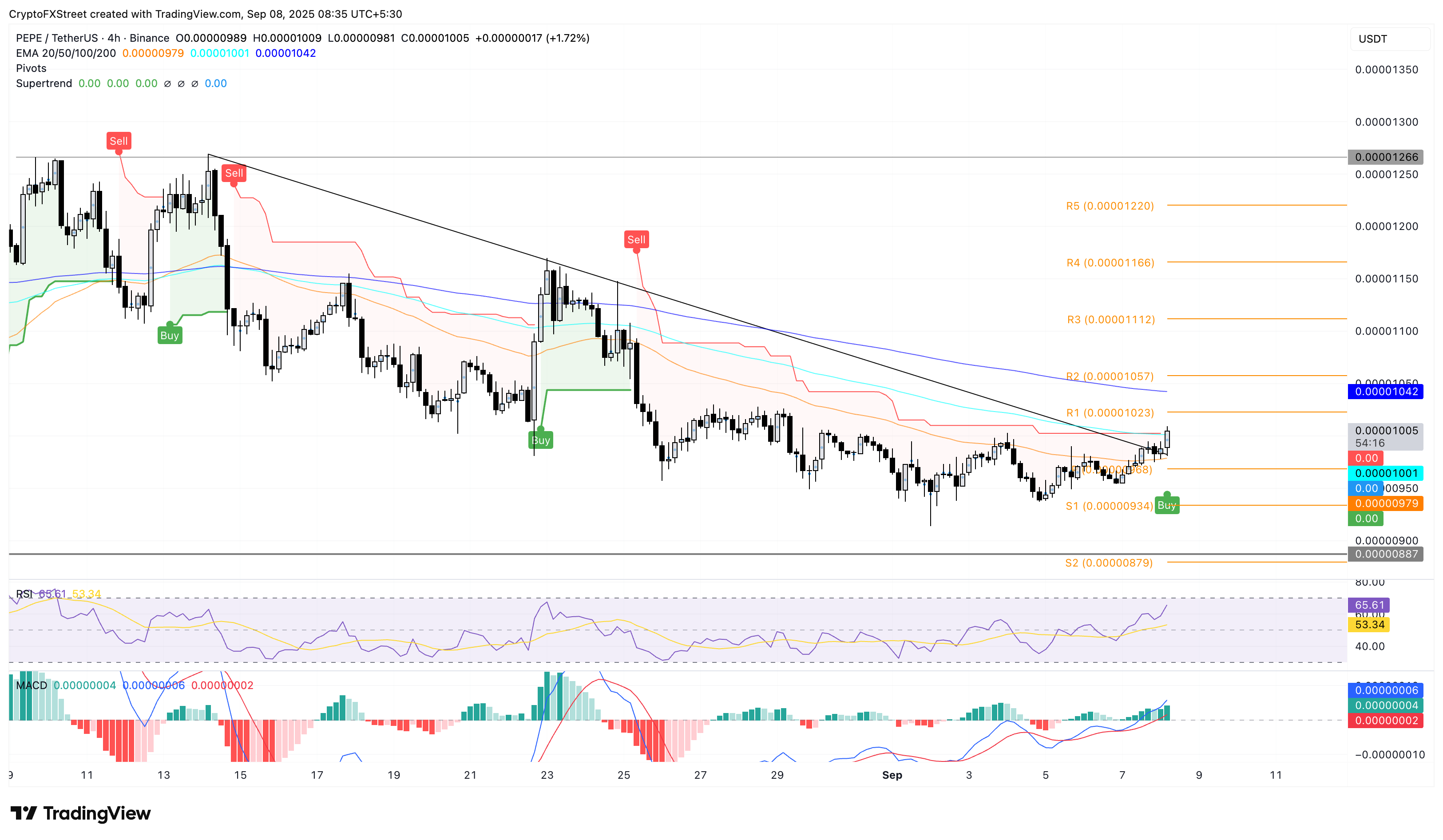 As Pepe reclaims a psychological level, the breakout rally targets the 200-period EMA at $0.00001042. An extended recovery could reach the R3 pivot level at $0.00001112.