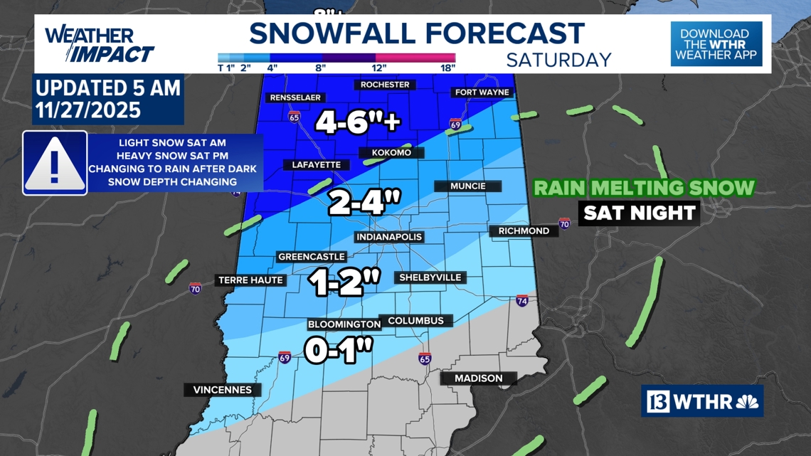 • Much of central Indiana transitions to mainly rain as temperatures rise.