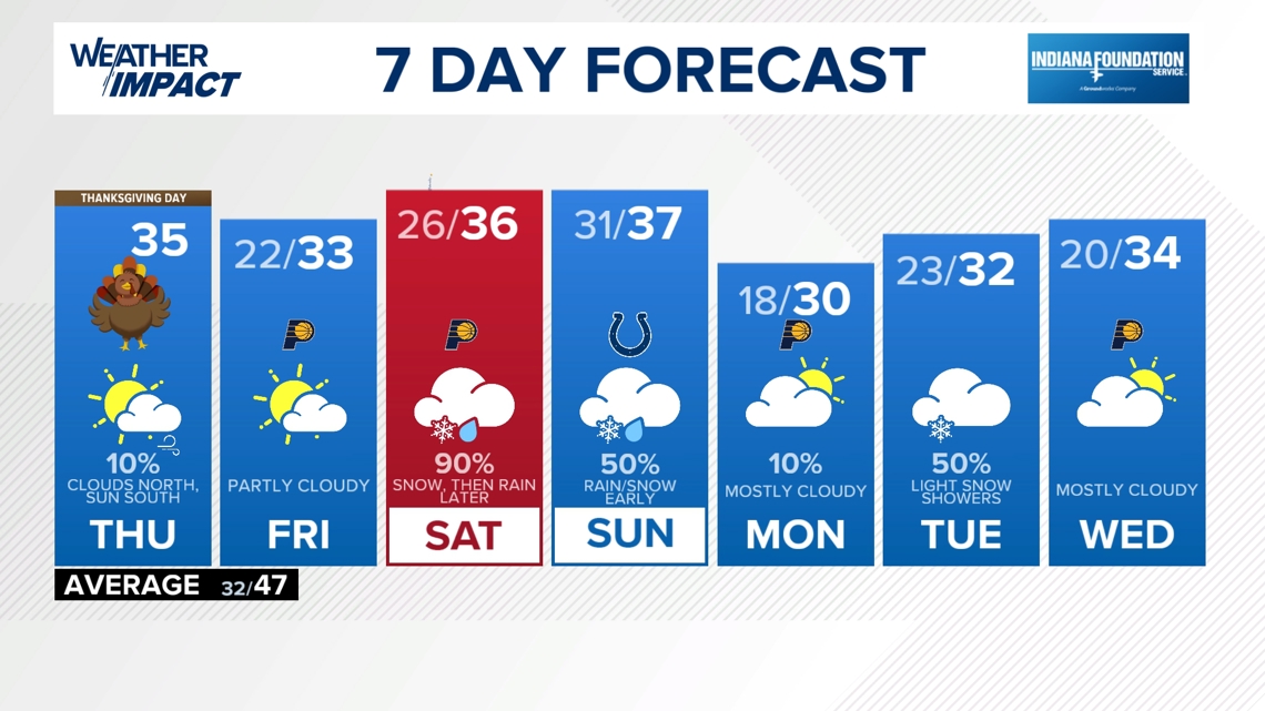 A cold Thanksgiving week is laying the groundwork for heavy snow at times this weekend across Indiana. Temperatures may bump up enough to switch slushy snow to rain, cutting snowfall totals down. Not everyone may make the switch. If you stay as snow, expect several inches of snowfall.
