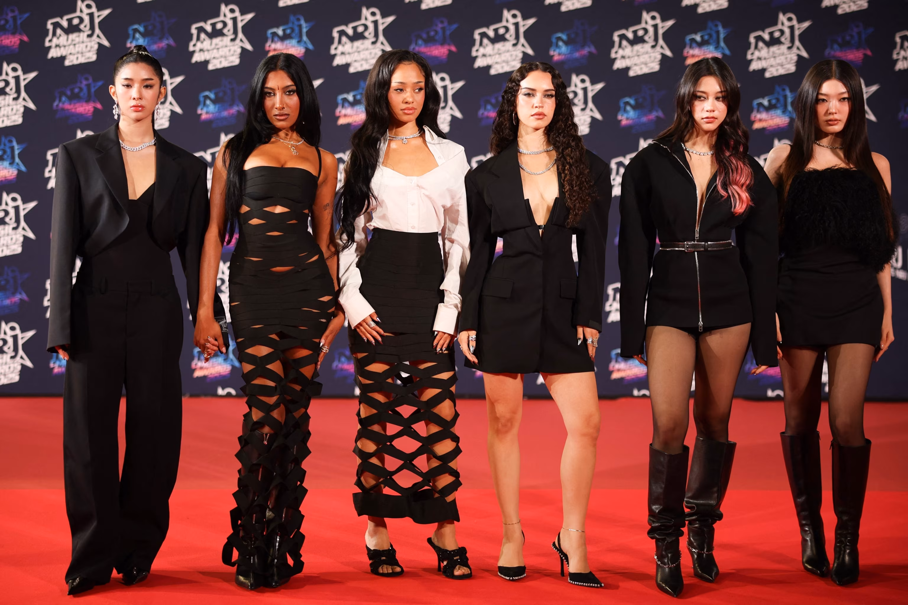 Members of the girl group Katseye pose upon arrival on the red carpet to attend the 27th edition of the NRJ Music Awards ceremony at the Palais des Festivals, in Cannes, southeastern France, October 31, 2025.